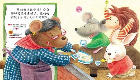 熊奶奶煮饺子喽!白白胖胖的饺子出锅啦,熊奶奶把饺子分到了大伙儿的碗里。