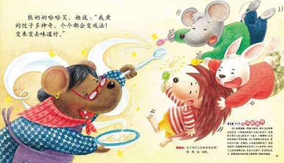 熊奶奶哈哈笑,她说:“我煮的饺子多神奇,个个都会变戏法!变来变去味道好。”