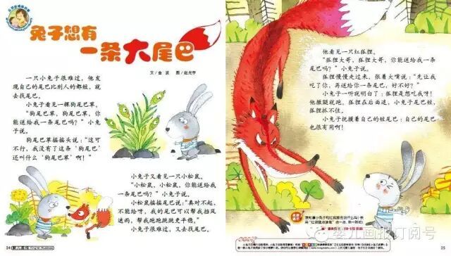 他看见一只红狐狸。“狐狸大哥,狐狸大哥,你能送给我一条尾巴吗?”小兔子说。