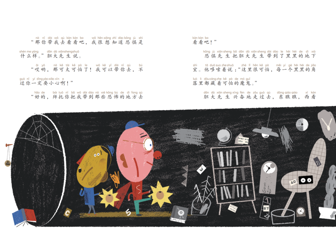 恐惧先生是世界上最胆小的先生,他对什么都感到害怕。直到有一天,恐惧先生遇到了胆大先生。胆大先生从不知道什么是恐惧,他很好奇,世界上究竟有什么东西是值得害怕的呢?他请求恐惧先生带他到那些恐怖的地方去看看……