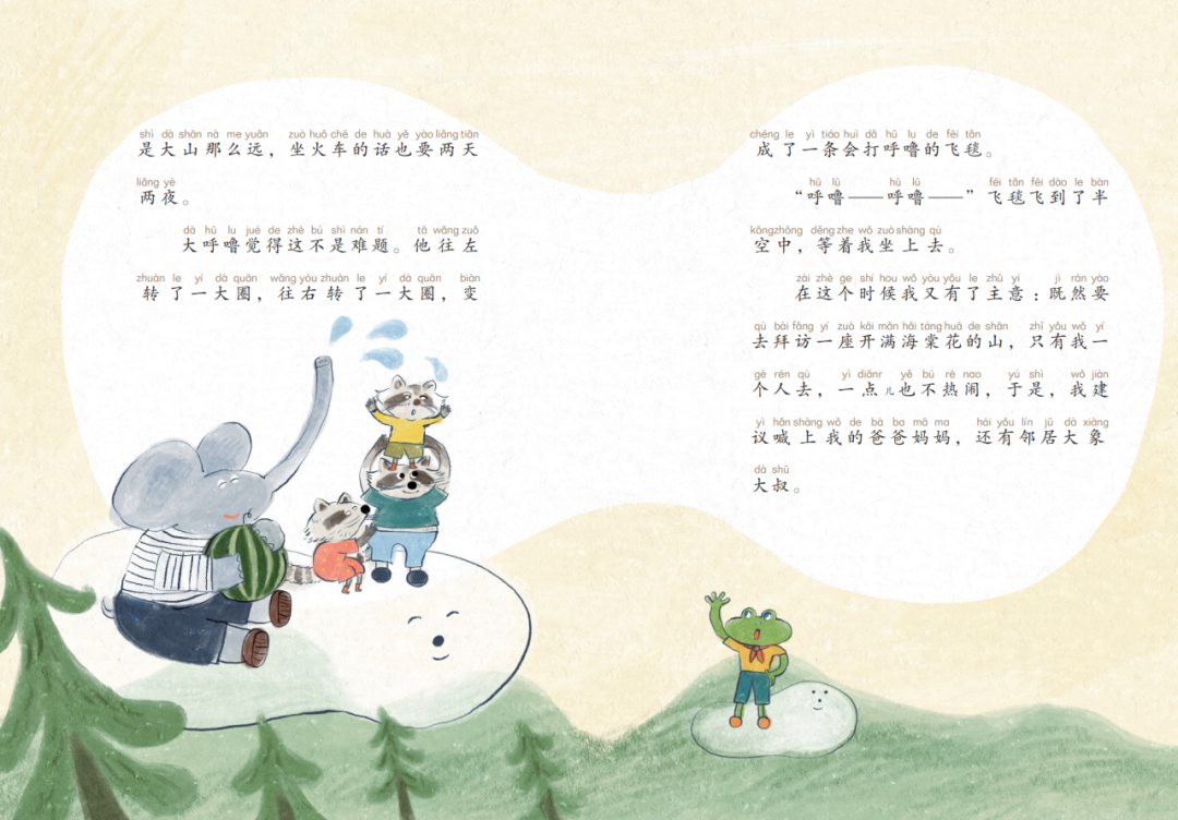 《我遇见了一个大呼噜》:星期六,我房间的衣柜里多了一个大呼噜。大呼噜这次来我家拜访的目的,就是邀请我到一座开满海棠花的山上做客。于是,我们就坐着一条会打呼噜的飞毯出发了……