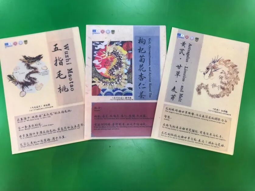 中医药拼贴画很受社团里的队员们的欢迎。“枸杞、菊花、玫瑰花、杏仁、柴胡、大血藤……”四年级队员梁宇炫用枸杞菊花杏仁茶的配方做出了一幅药材拼贴画,他给这幅作品起名《东方巨龙》。