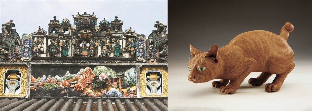 左为石湾陶塑瓦脊,右为清石湾窑陶塑金丝猫