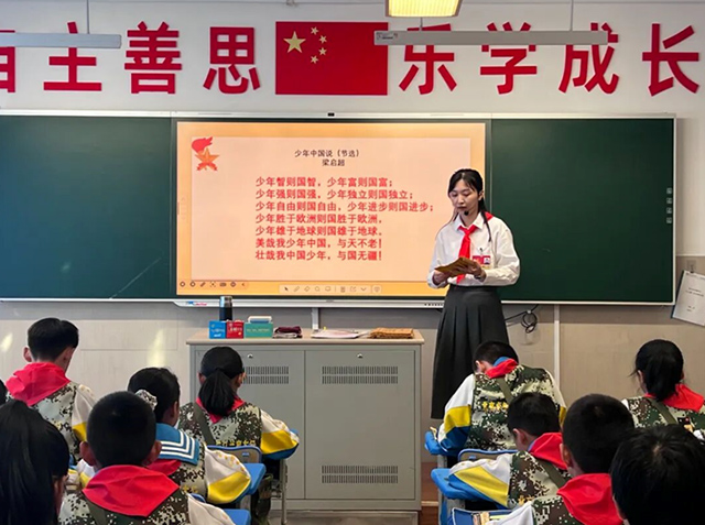启动仪式上,北京青少年服务中心少工委总辅导员常红老师,在国旗下为全体队员上了一节生动的少先队主题队课,为三个中队颁授中队旗,引导全体队员铭记峥嵘历史,传承英雄精神。最后,全体学生高喊“请党放心,强国有我”,将缅怀先烈的情感转化为“强国一代有我在”的坚定承诺,让仪式从“纪念过去”走向“激励未来”,彰显新时代少先队员的使命担当。