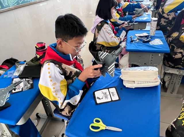 国防教育军事体验课是本次活动的“硬核”环节。来自北京青少年服务中心少工委的3名校外辅导员,分别以“光荣的少先队员”“长征精神永传承”“大国重器显国威”为主题,为150名少先队员讲授国防教育军事体验课。课上,不仅为队员们带来了九三阅兵当天现场观礼的请柬,还带领队员们拼插歼-35飞机模型;不仅让队员们感受祖国的日益强大,还通过在竹简上书写《少年中国说》、朗诵毛泽东《七律 长征》,感受中华优秀传统文化中的家国情怀,引领队员们传承红色基因、传承中华文脉、传承奋斗精神!