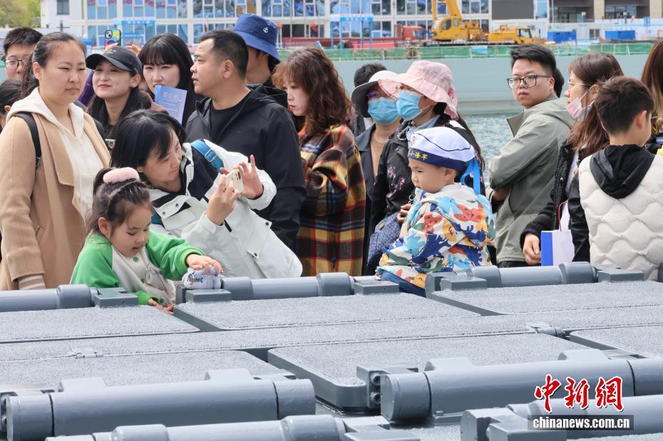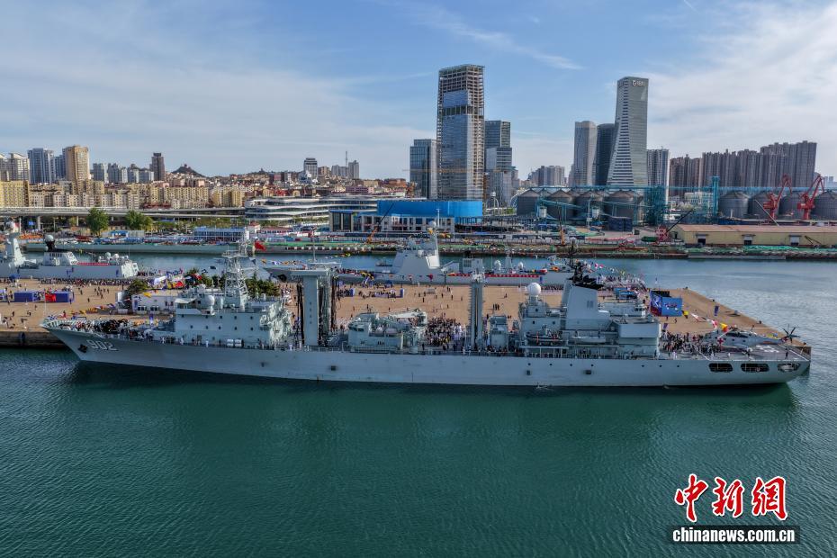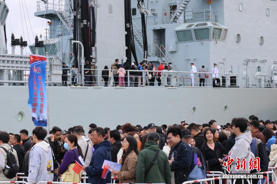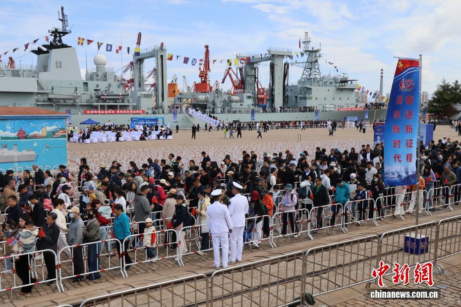 4月22日,人民海军成立77周年北部战区海军舰艇开放活动在山东青岛拉开序幕,吸引大量民众登舰参观。4月23日是人民海军成立77周年纪念日,海军于23日前后在中国十多个城市举行军营开放活动,四十多艘现役舰艇将与公众见面。本次活动,北部战区海军在青岛的两个码头开放6艘舰艇,将持续至4月26日。图为东平湖舰在青岛向民众开放。(无人机照片)