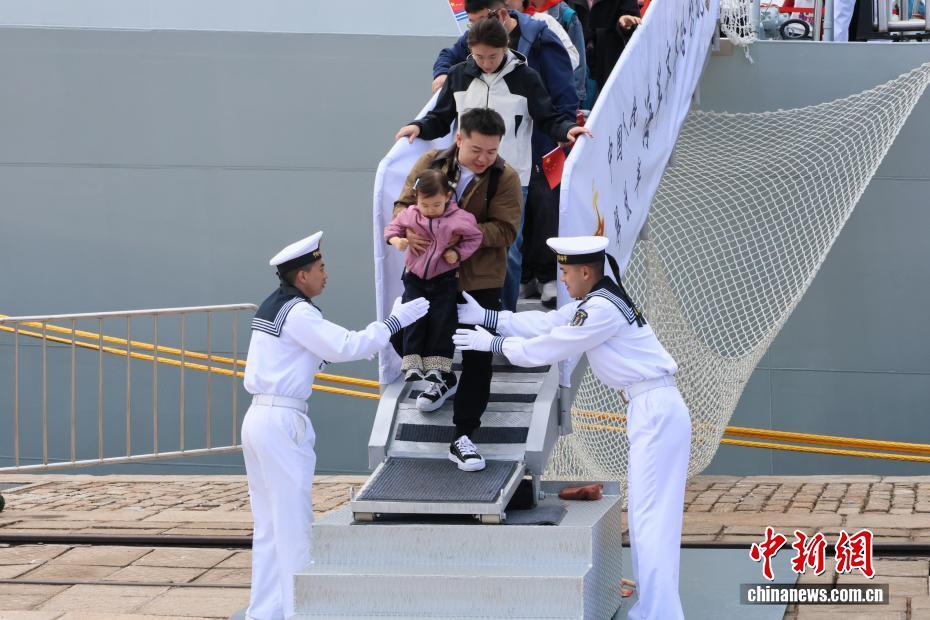 4月22日,人民海军成立77周年北部战区海军舰艇开放活动在山东青岛拉开序幕,吸引大量民众登舰参观。4月23日是人民海军成立77周年纪念日,海军于23日前后在中国十多个城市举行军营开放活动,四十多艘现役舰艇将与公众见面。本次活动,北部战区海军在青岛的两个码头开放6艘舰艇,将持续至4月26日。图为官兵帮助民众离舰。
