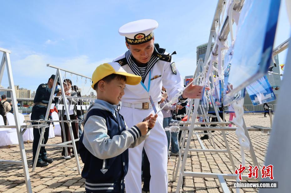 4月22日,人民海军成立77周年北部战区海军舰艇开放活动在山东青岛拉开序幕,吸引大量民众登舰参观。4月23日是人民海军成立77周年纪念日,海军于23日前后在中国十多个城市举行军营开放活动,四十多艘现役舰艇将与公众见面。本次活动,北部战区海军在青岛的两个码头开放6艘舰艇,将持续至4月26日。图为小朋友学习绳结技巧。