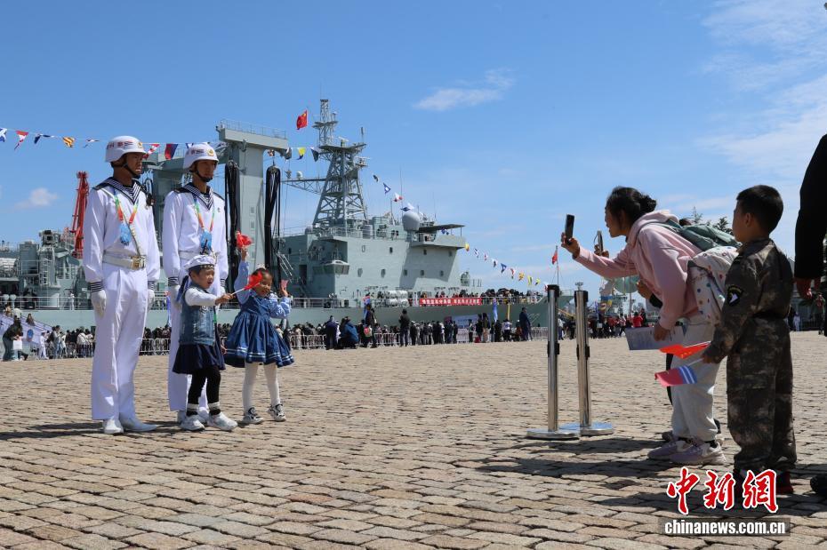 4月22日,人民海军成立77周年北部战区海军舰艇开放活动在山东青岛拉开序幕,吸引大量民众登舰参观。4月23日是人民海军成立77周年纪念日,海军于23日前后在中国十多个城市举行军营开放活动,四十多艘现役舰艇将与公众见面。本次活动,北部战区海军在青岛的两个码头开放6艘舰艇,将持续至4月26日。图为家长在舰艇甲板为小朋友拍照。