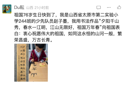 作为一名少先队员,我从身边小事做起,坚持每周末走出去,参与公益志愿者活动,捡垃圾,整理共享单车,擦洗健身器材……都有我的小小身影。我力所能及地做好公益,踏踏实实学习,用实际行动向祖国妈妈表白!祝福祖国妈妈76岁生日快乐!