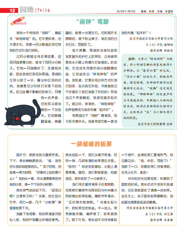 点评:文章以“特殊闹钟”为线索,将小野猫弯脚的形象刻画得十分鲜活。从“漆黑如墨”的毛发、 “雪白小靴”似的爪子,到缺角耳朵、圆亮眼睛,各种细节描写让其样呼之欲出,“跛脚”设定则更添怜爱。“哗啦哗啦”的饭盆声作为专属起床铃,串联起人与猫的温情互动,既写出其独特的打招呼方式,也体现出“我”与小猫无须言说的默契。