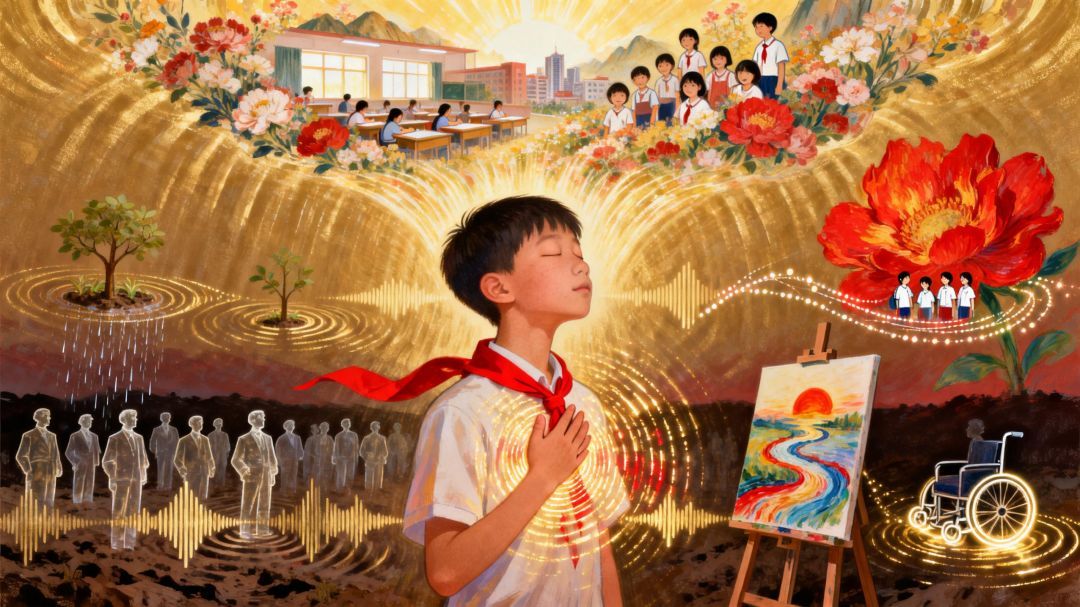 这句话,像一把钥匙,打开了我心里一扇懵懂的门。原来,声音不只能用耳朵听,还能用皮肤,用骨头,用心去“听”。 那么,那些为了新中国发出呐喊、最终长眠的先烈,他们的“声音”消失了吗?不,老师说,他们的声音化作了春风,吹拂着我们胸前的红领巾;化作了雨声,浇灌着校园里的小树。 这些,我都能“听见”——当红领巾拂过我的脸颊,当雨水顺着窗户流下我触摸的纹路。