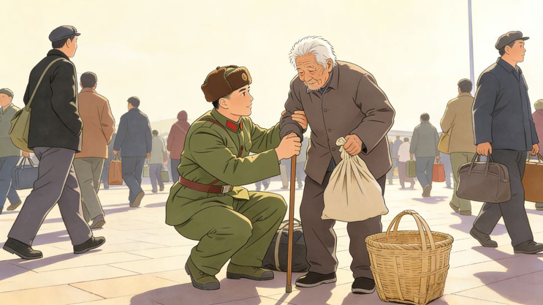 还有一次,他坐火车出差,一位老奶奶眯着眼,手背上凸起的青筋像细细的小蚯蚓,正颤巍巍地摸着座位号。雷锋立刻站起来,扶住她枯瘦的手腕:“老人家,别找啦,您就先坐在我的座位上吧!”等她安稳坐下,他又默默拿起扫帚,一下、两下……车厢被打扫得干干净净、亮堂堂的,像被阳光洗过一样。