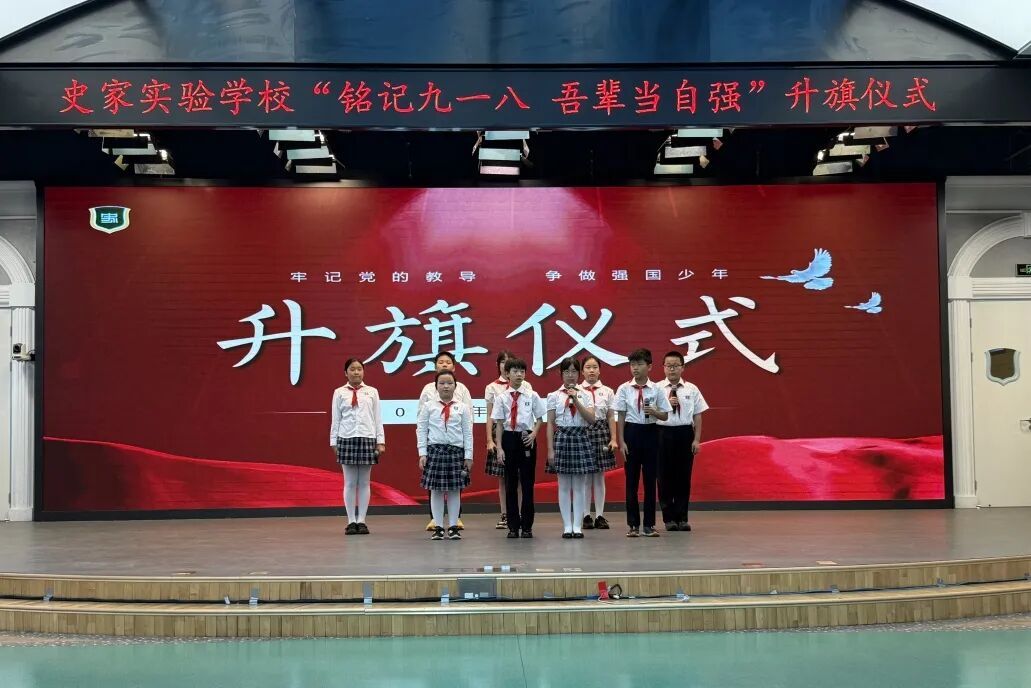 9月15日,史家实验学校高、低年级部的操场,“铭记九一八 吾辈当自强”主题升旗仪式庄严肃穆。队员们用饱含深情的诗朗诵表达了对那段屈辱历史的愤慨,激情澎湃的呐喊是对新时代少年的激励。难忘抗战岁月,难忘抗战英雄。