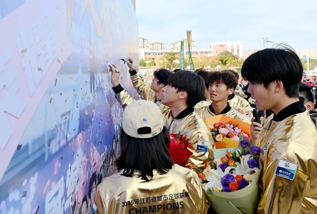 随后的赠球仪式,将活动推向了高潮。冠军队员们拿起签字笔,郑重地在每一颗足球上签下自己的名字。每一颗签名足球,都承载着足球英雄在“苏超”赛场逆风翻盘的拼搏故事,也寄托着足球英雄对队员坚守热爱、无畏向前的期许。当这些珍贵的签名足球被交到小队员手中时,传递的不仅是一份纪念,更是一份沉甸甸的期许和强大的精神动力,激励着每一位实验学校队员为热爱全力以赴,为梦想无畏向前。