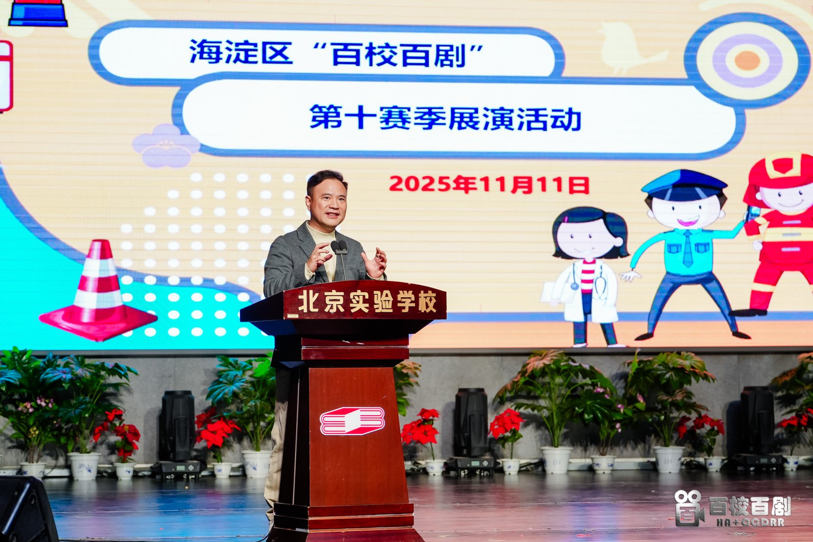 2025年11月11日下午,海淀区 “百校百剧” 第十赛季比赛在北京实验学校礼堂成功举行。教育部、应急管理部、北京市教委、北京市应急管理局、海淀区教委等单位相关领导,以及来自教育、应急管理、人工智能等领域的专家学者出席活动,与现场师生共同见证这场融合安全知识与AI艺术的校园文化盛宴。