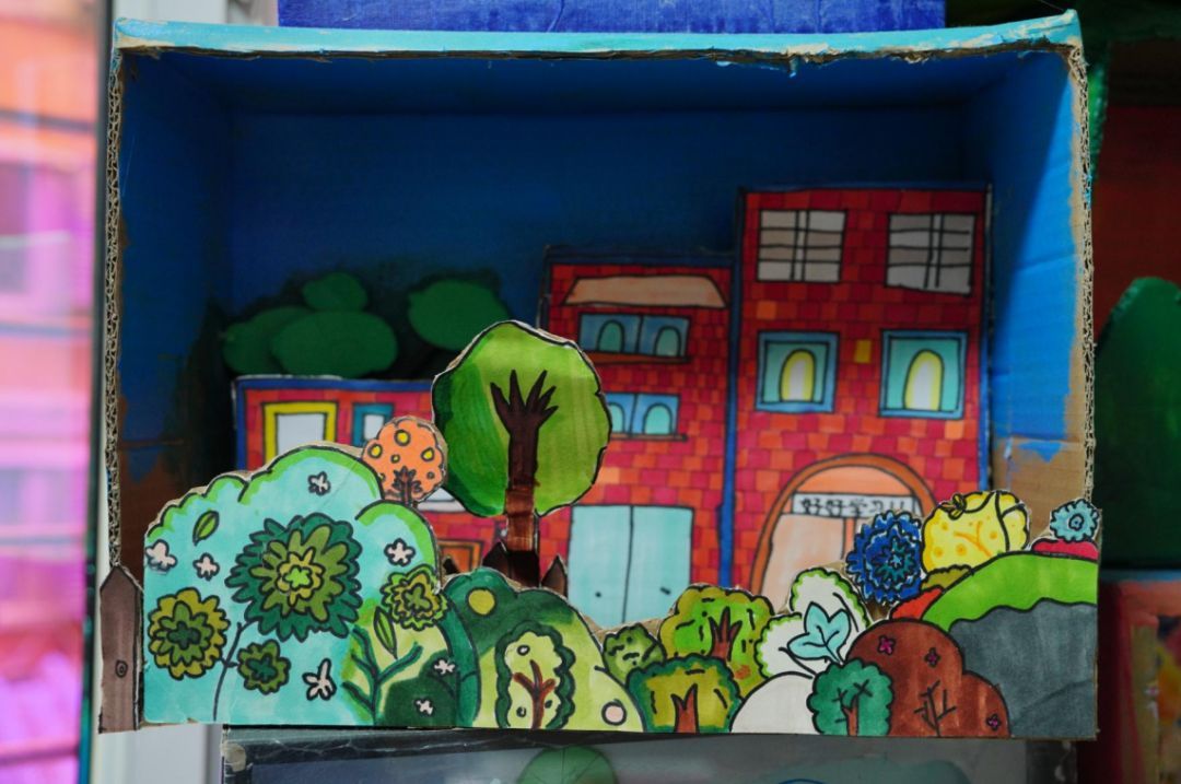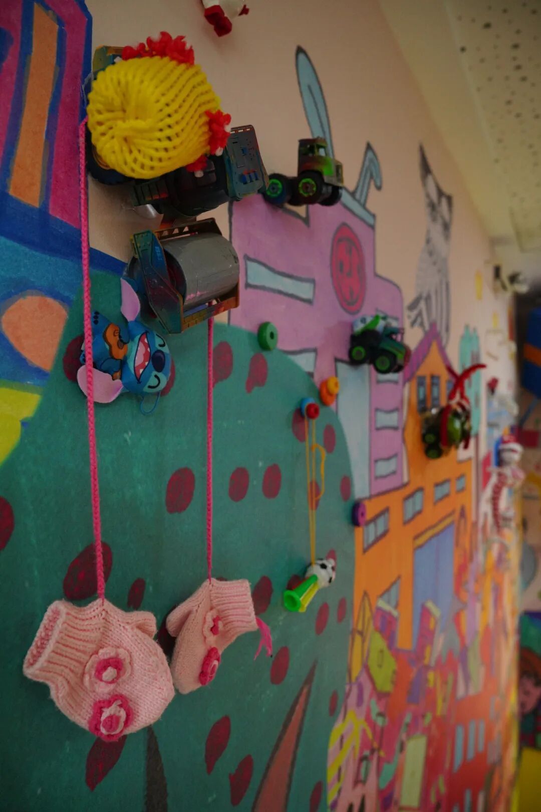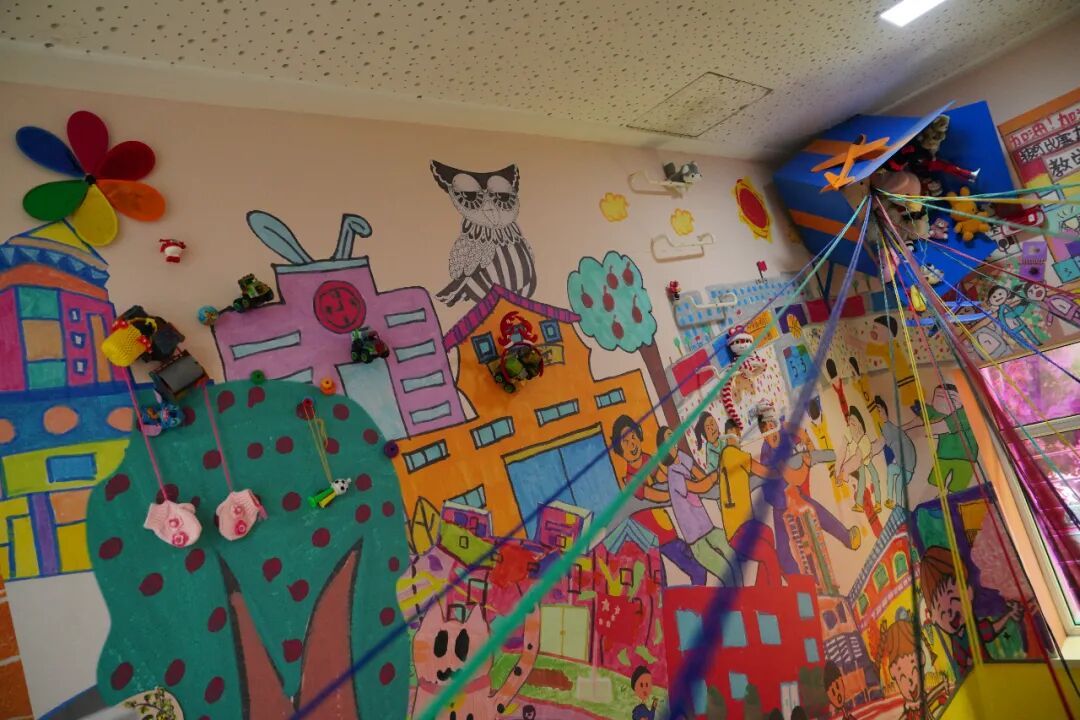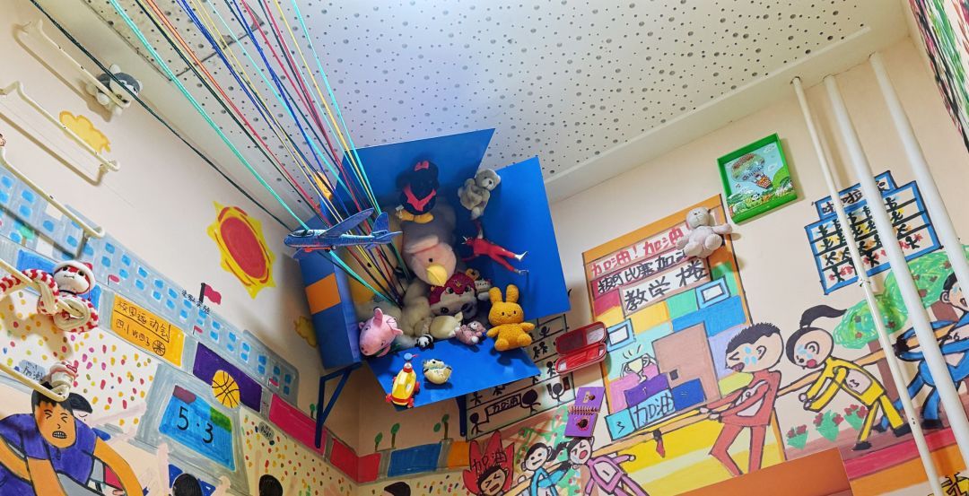 美术馆的指导老师们从孩子们充满童真与想象力的画作中,提炼出色彩、线条、图形等核心艺术元素,并以此为“基因”,运用现代拼贴艺术手法,为我校精心设计并绘制了一面极具视觉冲击力的楼道墙绘和搭建了立体空间作品。