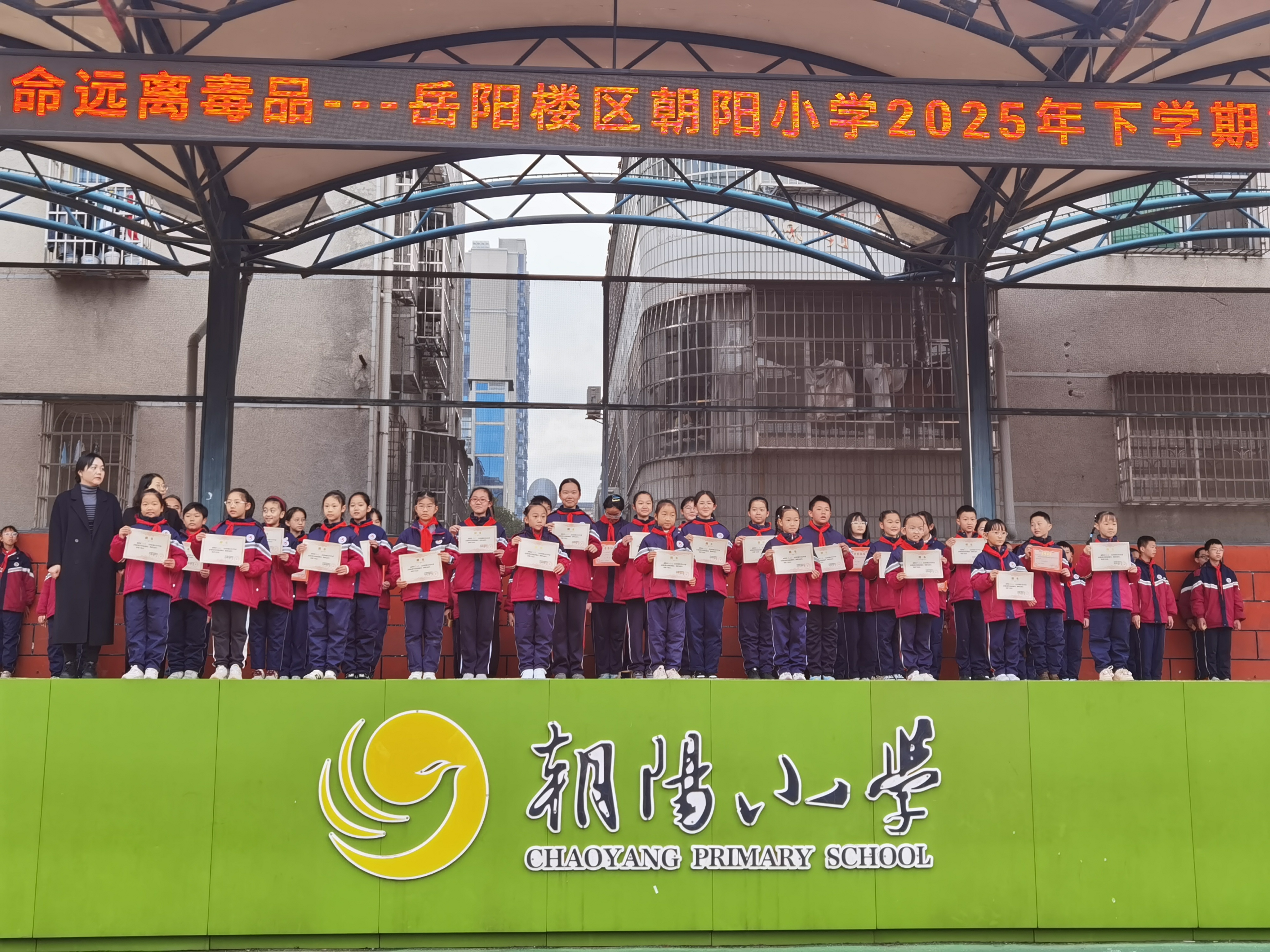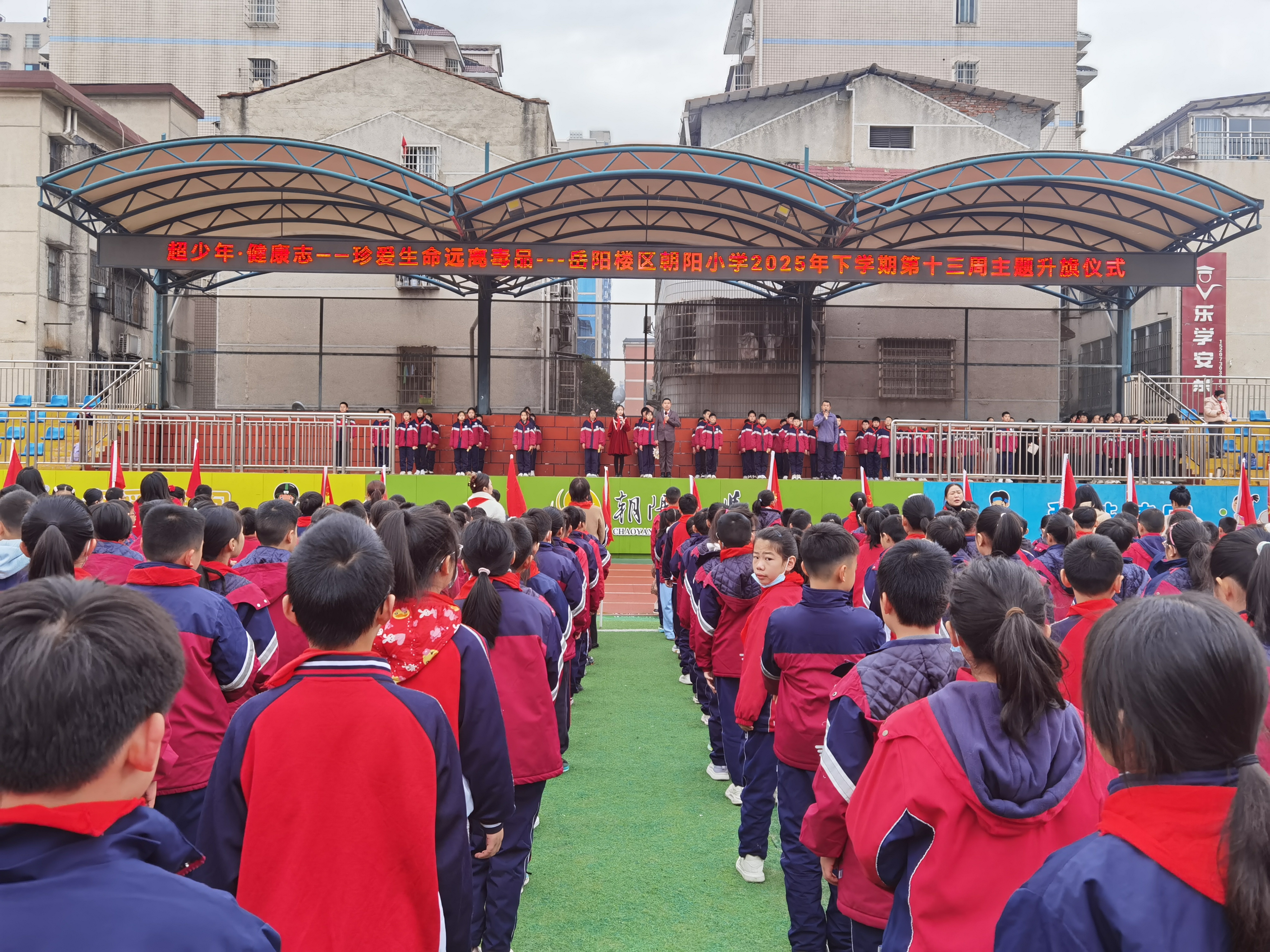 为进一步织密青少年禁毒防护网,提升学生识毒、防毒、拒毒的意识与能力,2025年11月24 日上午,湖南省岳阳市岳阳楼区朝阳小学在学校操场举行“珍爱生命,远离毒品”主题升旗仪式,全校师生齐聚绿茵场,共同奏响禁毒教育的青春乐章。