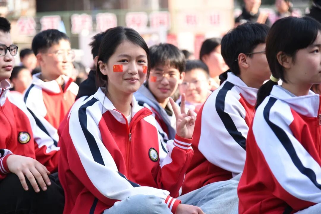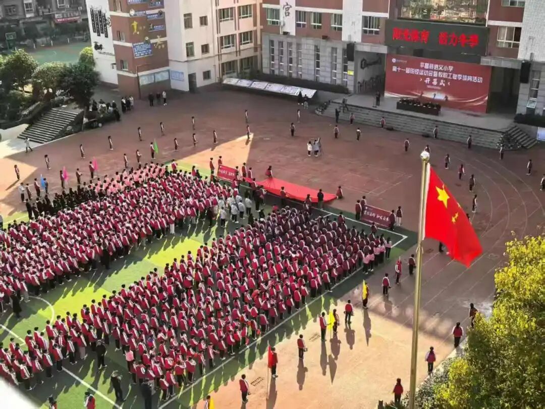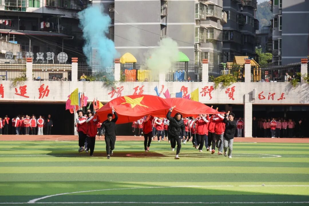 操场上彩旗飞扬,师生热情高涨,