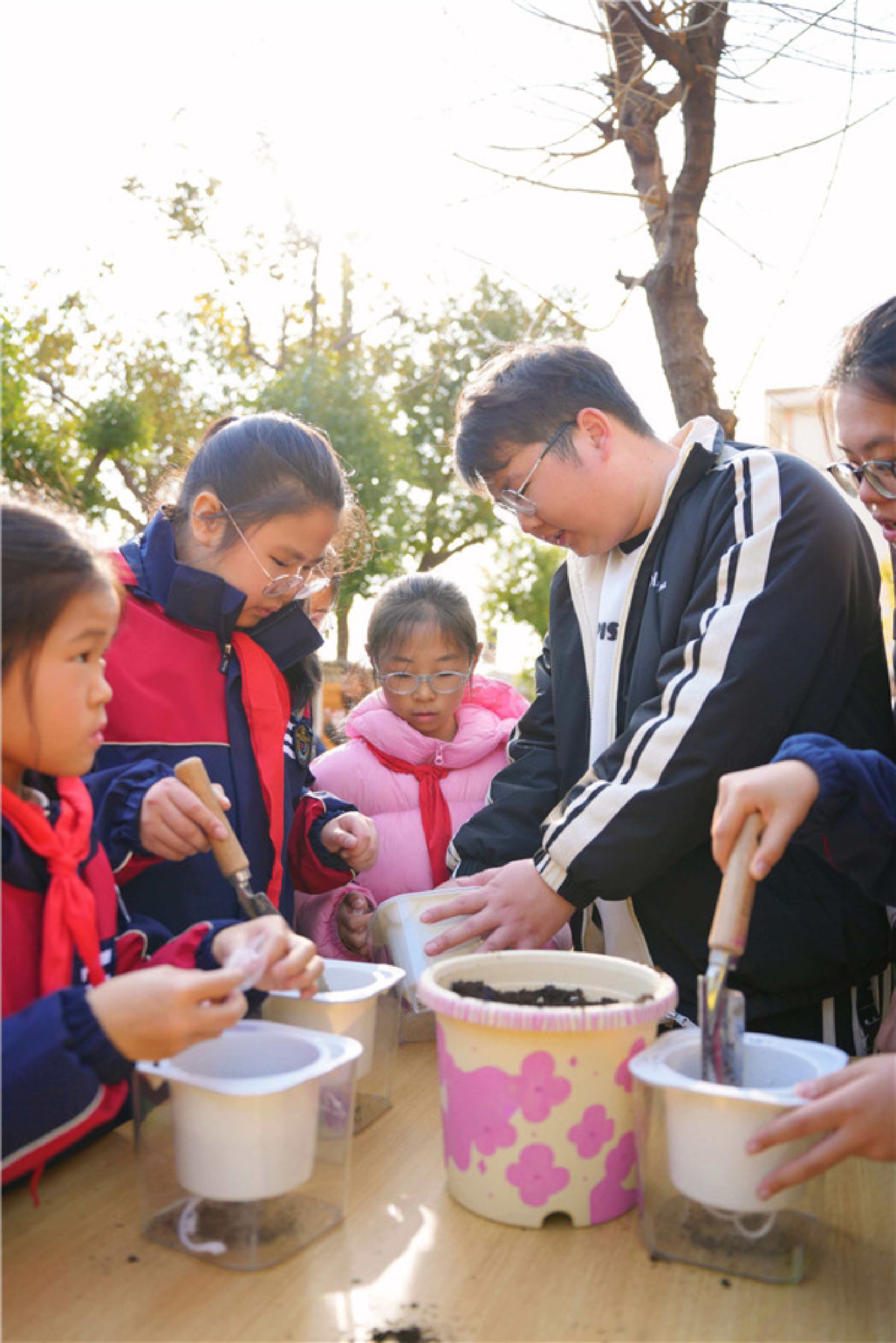 “共植青绿”环节将活动推向了实践的高潮。在“大手拉小手”结对环节,宁波大学的学生代表与学校艺耕园学伴小组一一结对,共同领取了象征希望的种子。随后,大小学生们携手走进艺耕园,挥锹挖坑、扶苗填土、提水浇灌,共同栽下了一株株希望之苗。现场欢声笑语,忙碌的身影与嫩绿的幼苗构成了一幅生机勃勃的春耕图景。