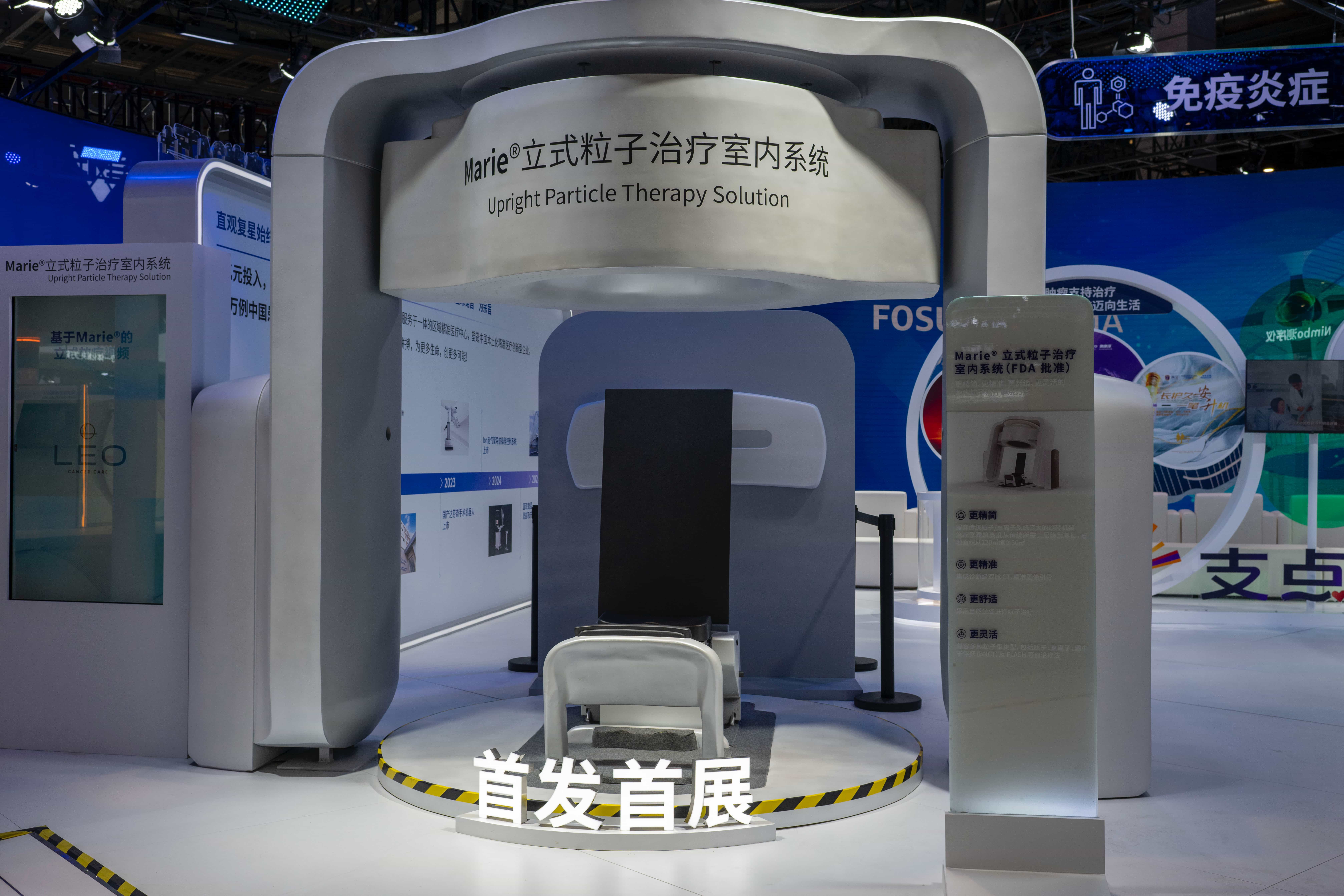 在第八届进博会医疗器械及医药保健展区,复星医药展出的首展产品——Marie®立式粒子治疗室内系统。人民网记者 翁奇羽摄