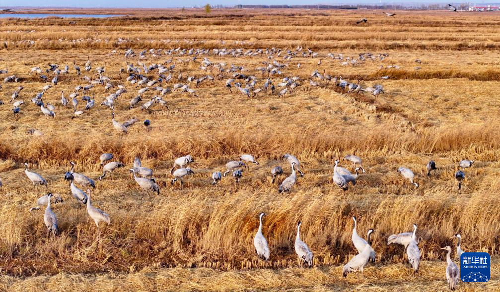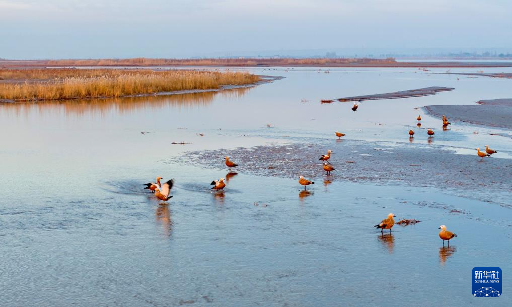 11月8日,候鸟在宁夏平罗天河湾国家湿地公园栖息觅食(无人机照片)。