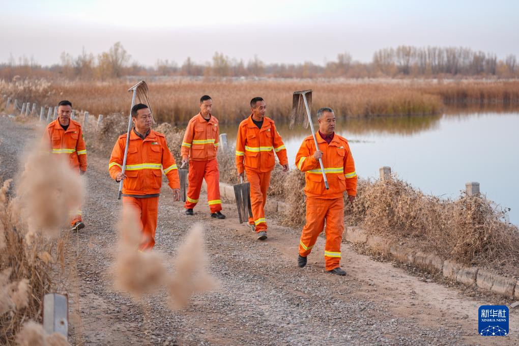11月11日,工作人员在宁夏平罗天河湾国家湿地公园内巡查。