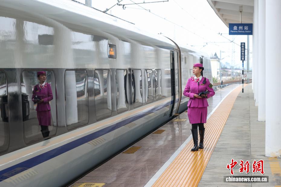 11月20日,贵州省盘州市,贵阳客运段乘务员在盘州站月台巡视。贵州盘州至兴义高速铁路(盘兴高铁)全长约99公里,设计时速250公里,自沪昆客专盘州站引出,经盘州市石桥镇、响水镇、保田镇进入黔西南州兴义市,是贵州省“市市通高铁”的最后一个项目。盘兴高铁共设车站3座,其中改建盘州站,新建保田站、兴义南站。该高铁将于2025年11月底通车,通车后贵阳至贵州省内8个市(州)中心城市将形成1至2小时高铁交通圈。