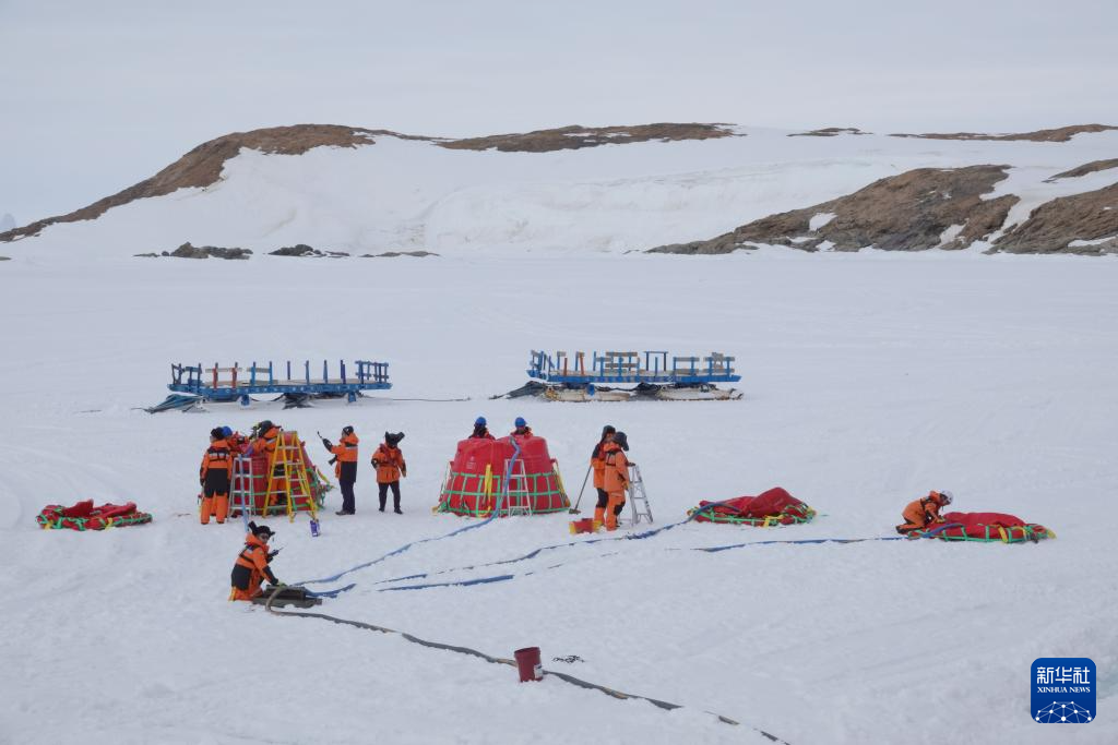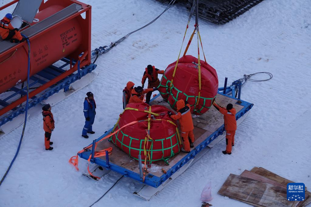 北京时间12月2日傍晚,工作人员在冰面上进行油囊加注作业。