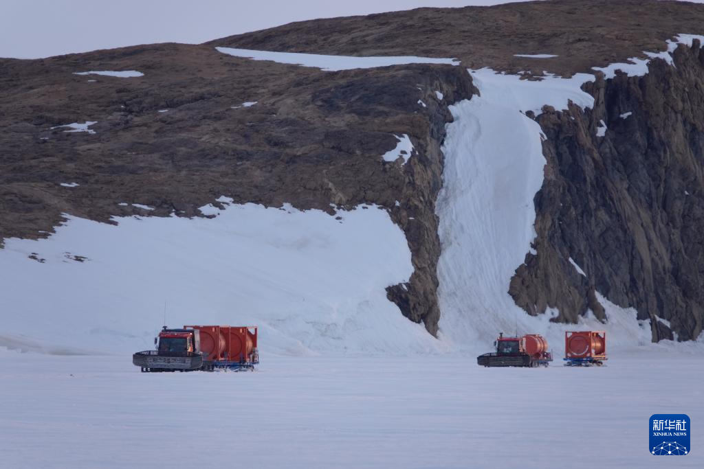 北京时间12月3日凌晨,从中山站和内陆出发基地驶来的雪地车拉着空油罐抵近“雪龙2”号。