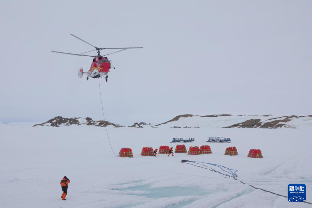 北京时间12月2日傍晚,“雪鹰102”直升机从“雪龙”号甲板飞至“雪龙2”号船侧冰面作业点,开启油囊吊挂作业。