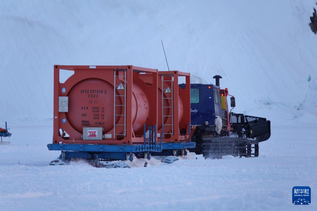 北京时间12月3日凌晨,雪地车拉着加满燃油的油罐离开“雪龙2”号,驶向中山站。