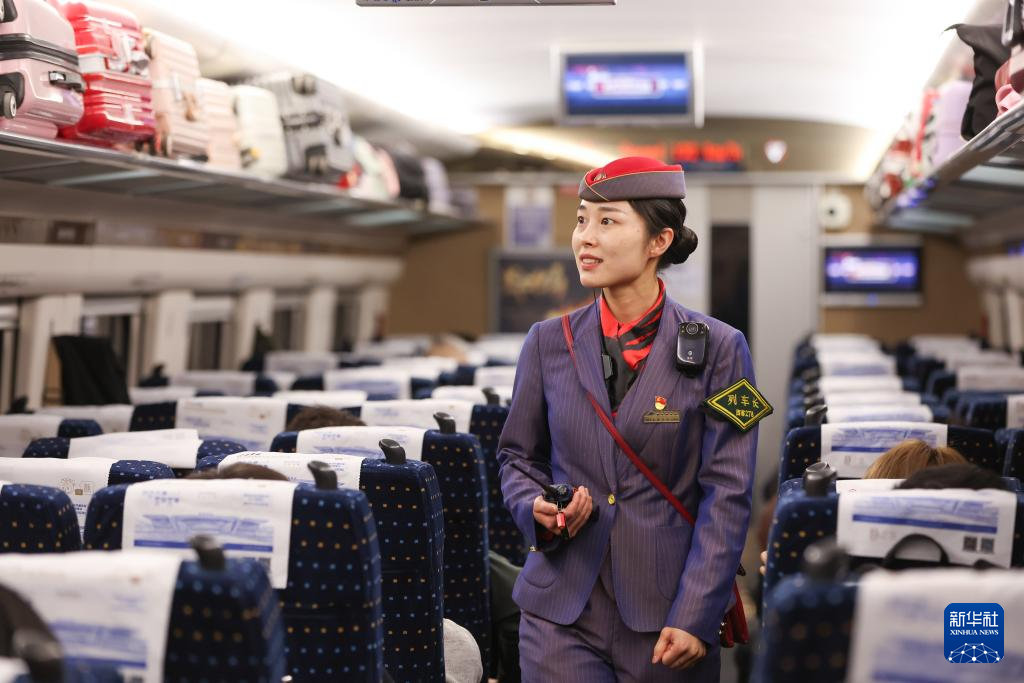 2月18日,列车长在西安北开往武威东的D2719次高铁列车“静音车厢”内巡视。