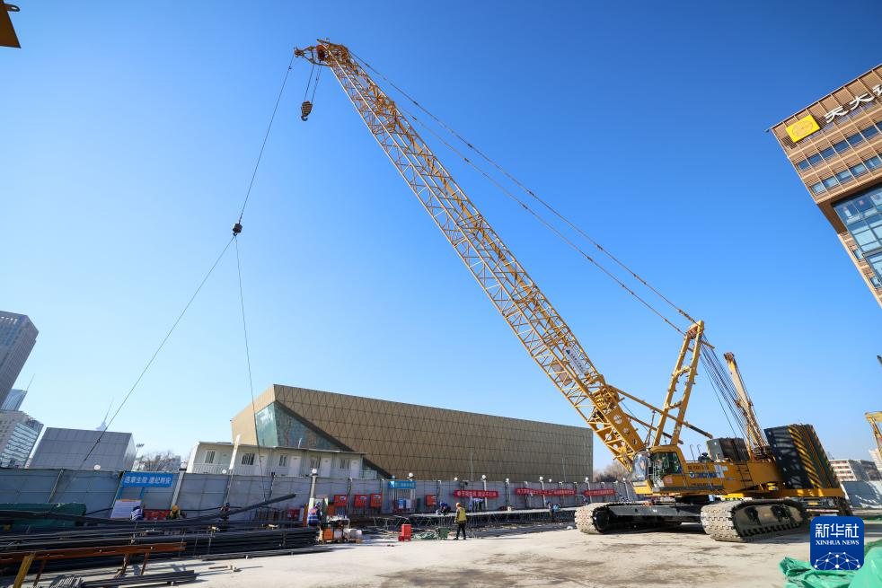 2月18日,施工人员在天津地铁八号线一期工程六里台站建设现场操作起重机起吊钢筋。