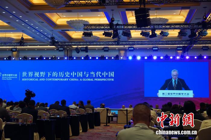美国加州大学伯克利分校社会学系荣休教授高棣民10月14日在上海第二届世界中国学大会上致辞。中新网 巩微微 摄