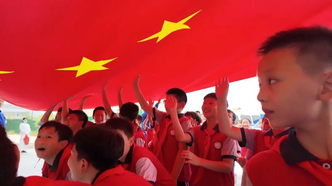 在孩子们的《歌唱祖国》歌声中,蓝天救援队队员们小心翼翼地将这面特殊的国旗缓缓展开。当国旗在眼前舒展,学生们按捺不住内心的激动,轻轻伸出手触摸着国旗的一角,脸上满是崇敬与自豪。