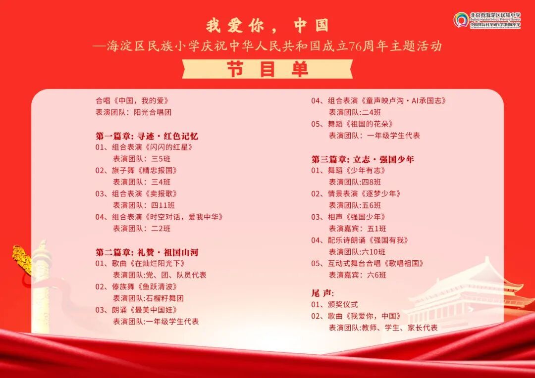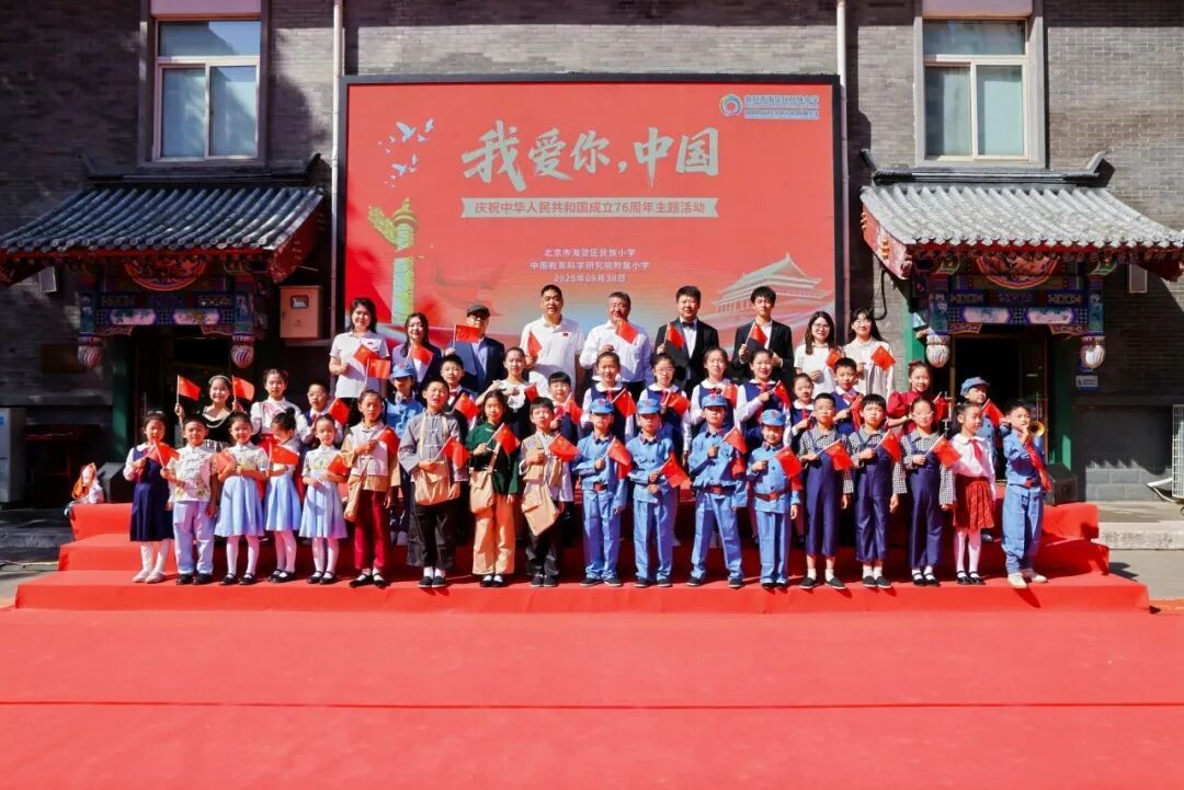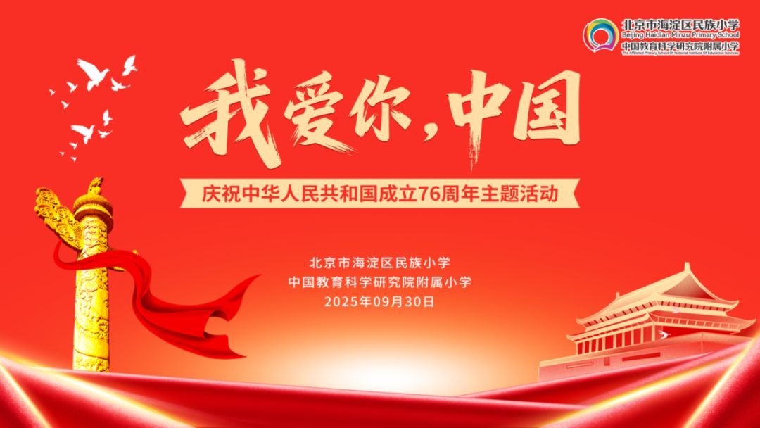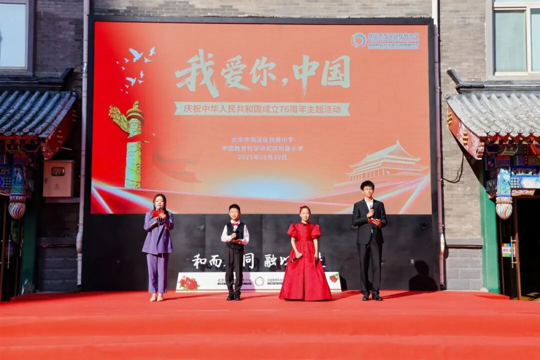 在中华人民共和国成立76周年与中国人民抗日战争暨世界反法西斯战争胜利80周年的特殊交汇时刻,海淀区民族小学举办“我爱你,中国”主题庆祝活动。全校师生齐聚一堂,重温红色记忆、礼赞祖国山河、立下强国志向,在庄重与热烈的氛围中厚植家国情怀。