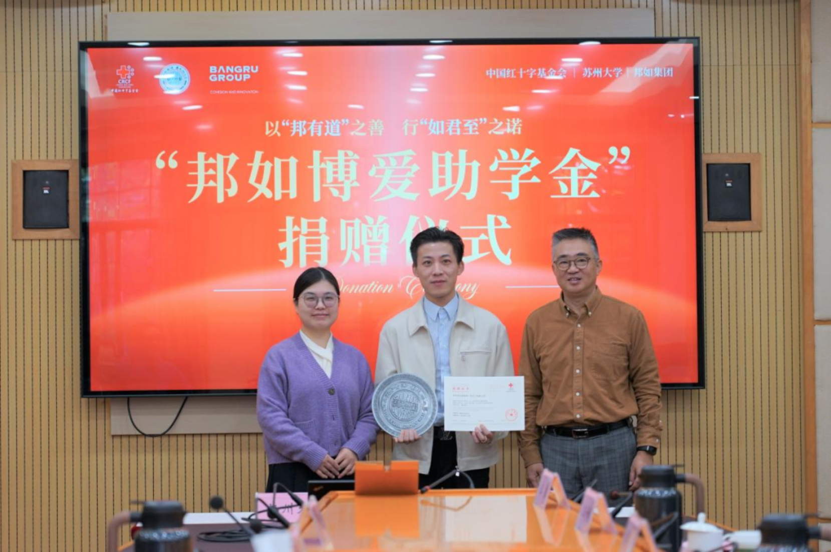 11月18日,中国红十字基金会“邦如博爱助学金”捐赠仪式在苏州大学顺利举行。中国红十字基金会医疗救助部部长仰卓子,邦如集团总经理周阳,苏州大学国内合作发展处处长、教育发展基金会秘书长程晓军,红十字国际学院常务副院长郑庚,党委学生工作部(学生工作处)副部(处)长谢凯,国内合作发展处副处长、教育发展基金会副秘书长刘子静等出席活动。