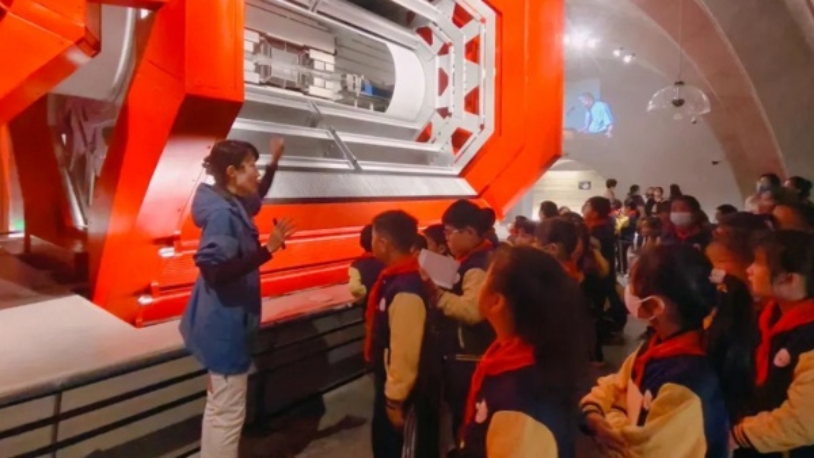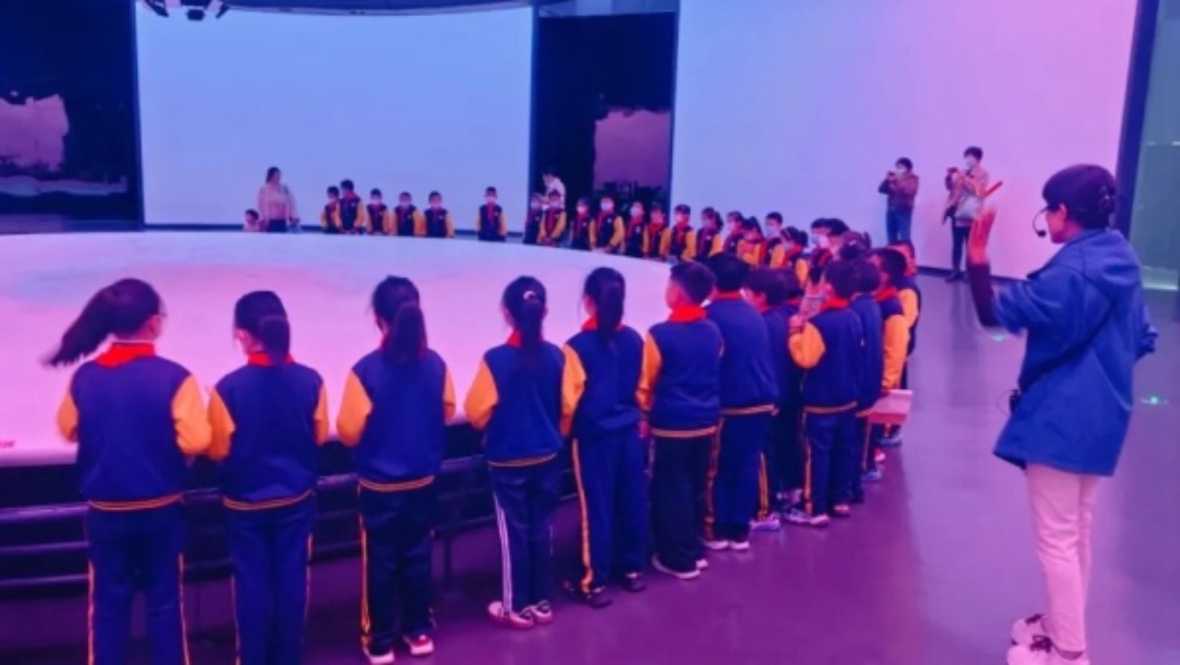 在科技馆序厅,同学们从宏观世界步入五彩斑斓的微观世界,从原子到夸克、从粒子到量子,通过沉浸式全景观影,初步了解了物质的构成与生命的起源,感受到了科学世界的奇妙与深邃。