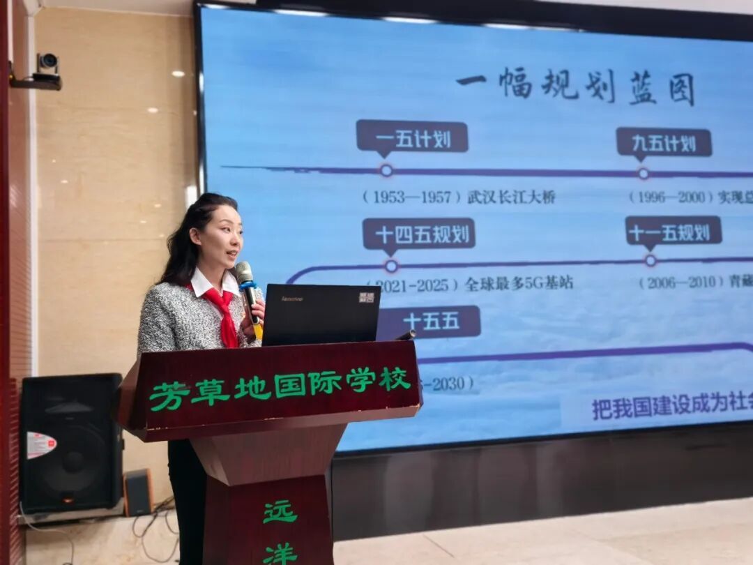 首先,由学校党支部副书记李梅用适合少先队员理解的“儿童化”政治语言,结合图片、数据图表等可视化素材,生动讲述“十四五”期间在科技创新(如航天、5G)、绿色发展等方面的标志性成就,并将国家成就与同学们的日常生活联系起来,点明这些伟大成就,是亿万中国人民在中国共产党的领导下,通过辛勤劳动、诚实劳动、创造性劳动取得的,从而自然过渡到“劳动”和“劳动者”的主题,为劳模出场做铺垫;同时鼓励同学们关注国家发展,将个人成长融入国家进步的大潮中。