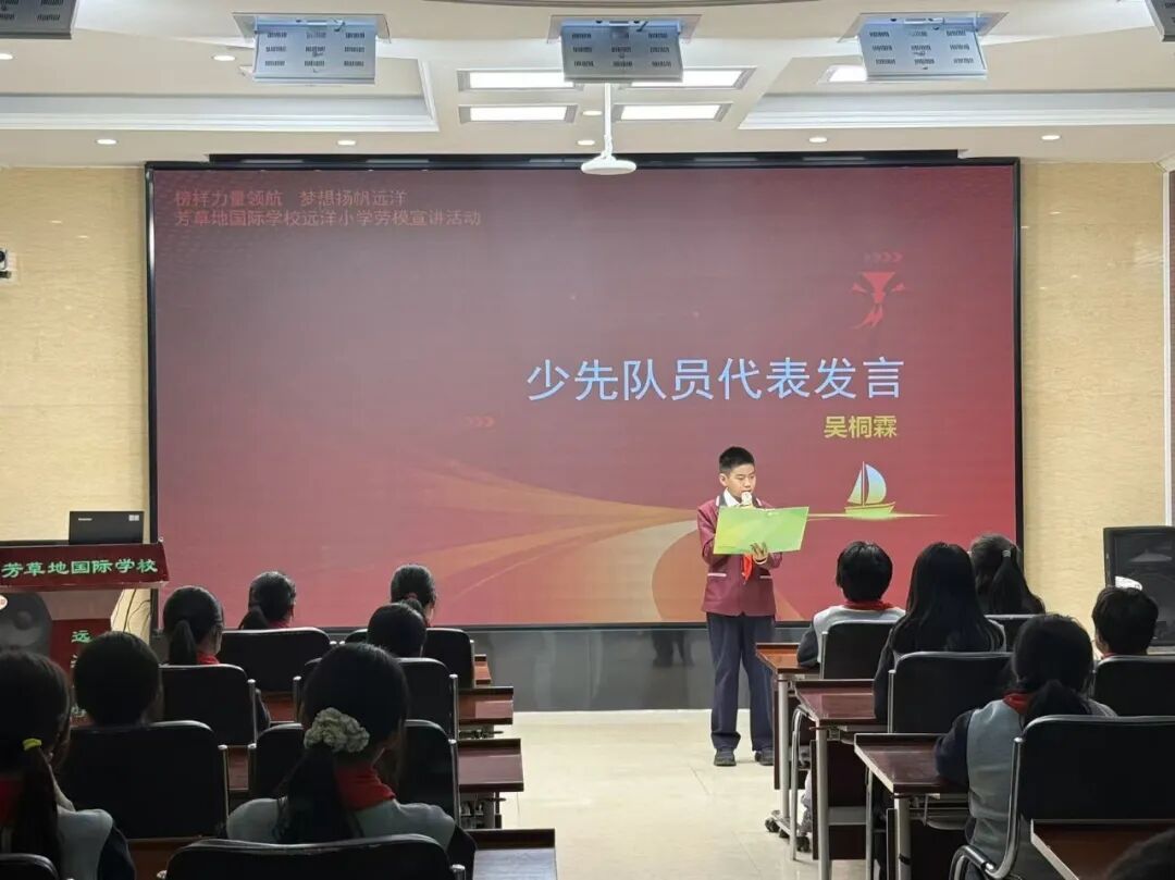 聆听完劳模的感人故事,少先队员代表吴桐霖同学激动地分享了他的感悟。他说道:“王建生叔叔的故事让我深受震撼!原来伟大就蕴藏在日复一日的坚持和钻研之中。我们作为新时代的少先队员,一定要以劳模为榜样,热爱劳动、勤奋学习,用知识和汗水为梦想插上翅膀,让我们的理想之舟在远洋校园里扬帆起航!”