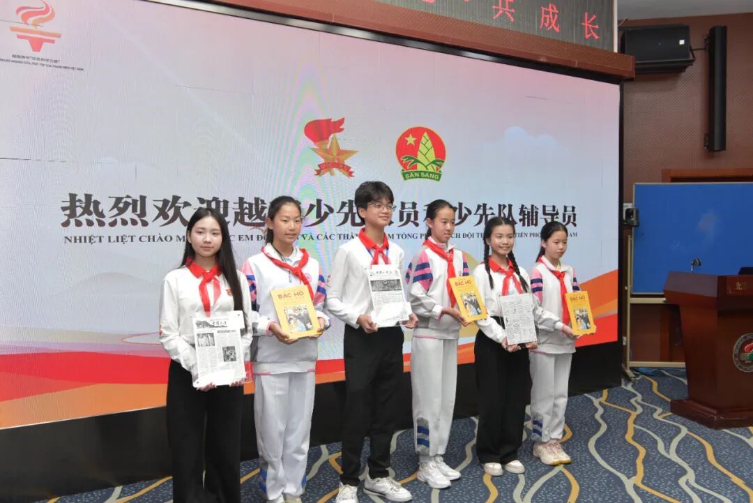 互赠礼物环节,将现场的氛围推向高潮。“这是一份出版于1955年7月11日的《中国少年报》……”当中国少先队员代表,郑重地捧出三份出版于1955年的《中国少年报》影印版时,全场的目光都被吸引了过去,它记录了当年胡志明主席到访中国时,与毛泽东主席一起参加重要活动,以及访问小学看望少先队员的温暖故事。