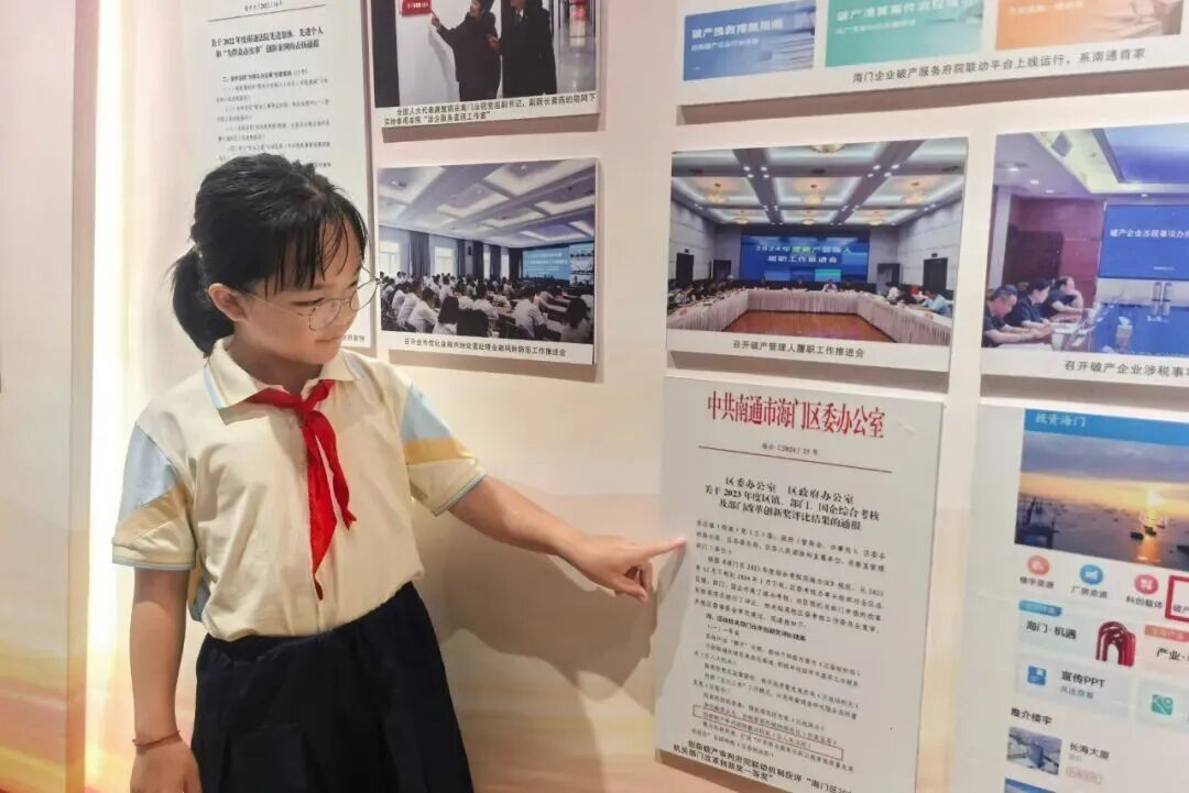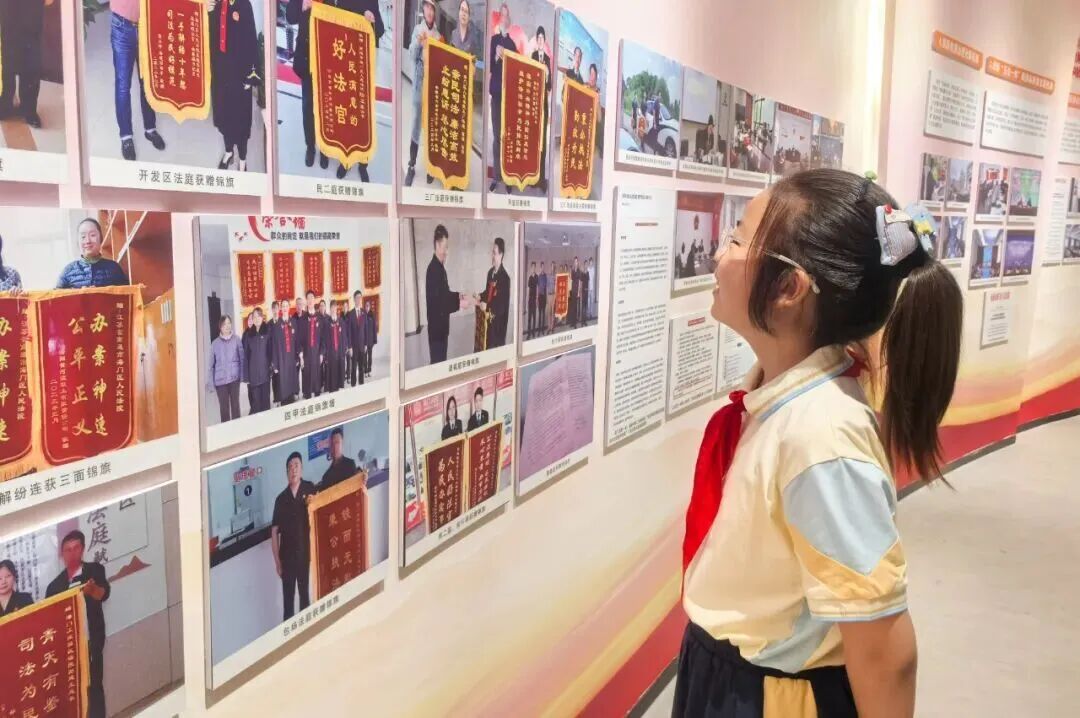 随后,队员们跟随着引导,走进海门法院历史展区。展柜里,泛黄的早年案卷上仍留着前辈法官工整的批注,锈迹斑斑的旧法槌静静“诉说”着过往,墙上的时间轴则清晰勾勒出法院从简陋办公点到现代化法庭的变迁。