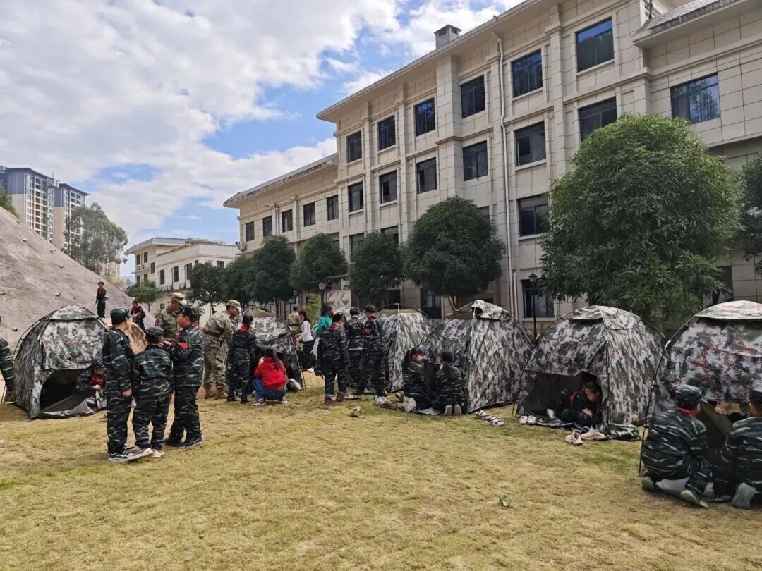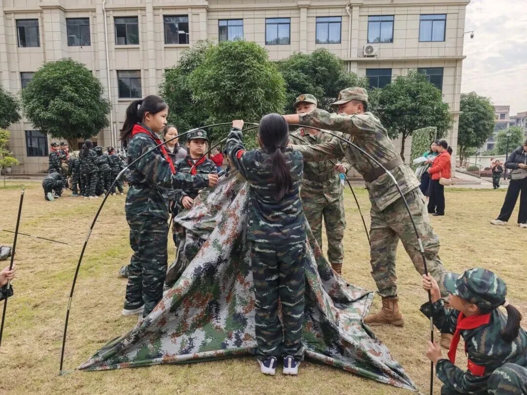 队员们化身“户外小达人”,在教官的指导下,从认清帐篷配件、理清搭建步骤,到分工协作撑支架、拉风绳、铺地垫,每一个环节都充满挑战与乐趣。