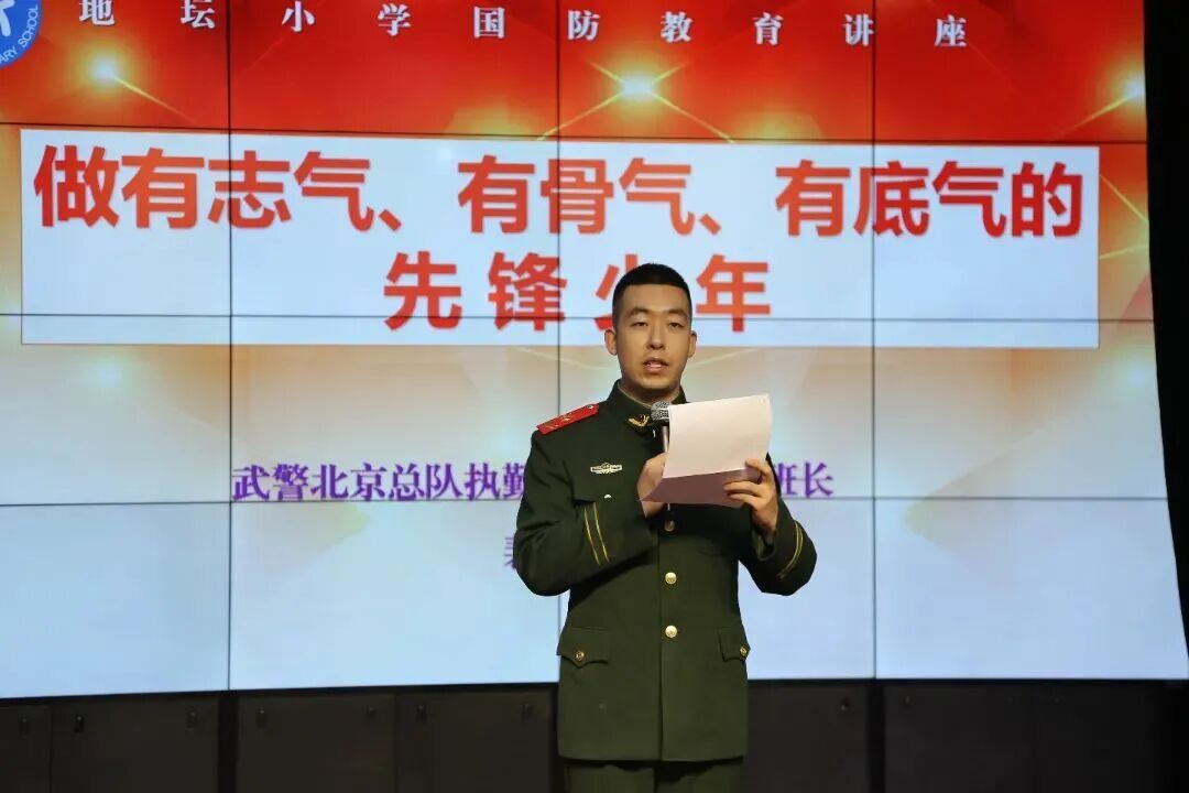 武警北京总队执勤分队的裴班长为队员们带来了《做有志气、有骨气、有底气的先锋少年》国防教育主题讲座。他教导队员们要认真读书,好好学习,努力成长为对祖国有贡献的新时代好少年。