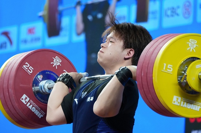 11月20日,陕西队王贵洲在挺举比赛中。(十五运会官方图片)