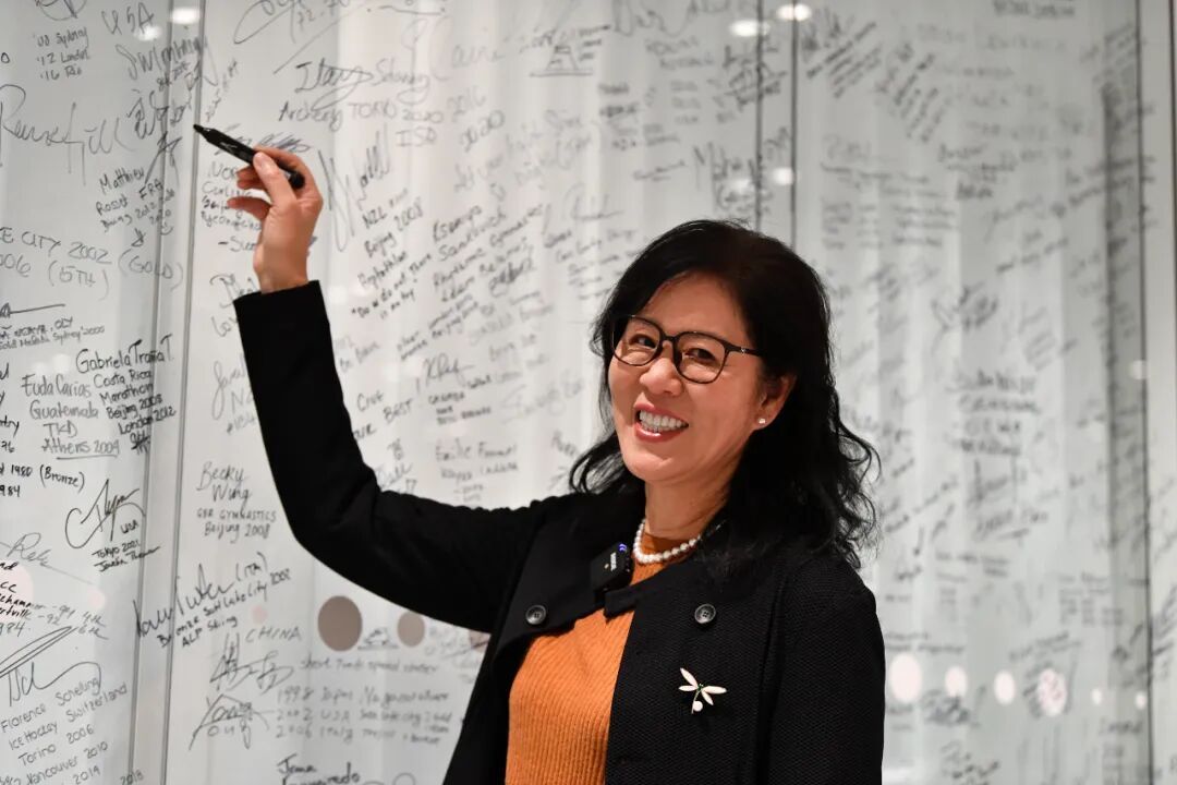 11月24日,郎平颁奖仪式后在签名墙上签名。 新华社记者 连漪 摄