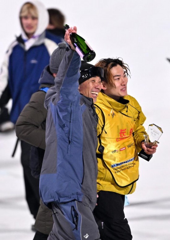 12月6日,冠军中国选手苏翊鸣(右)与教练佐藤康弘在颁奖仪式后庆祝。新华社记者 陶希夷 摄
