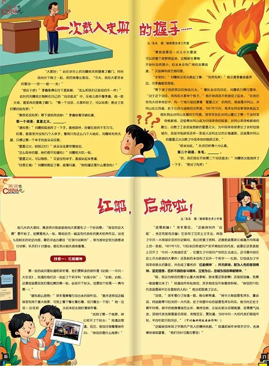 我们杂志有几个特别出彩的原创栏目,如:《寻访身边的红色宝贝》《大人物档案》和《画说党史》等!它们可是“青少年期刊讲党史”主题宣传的重点选题呢!