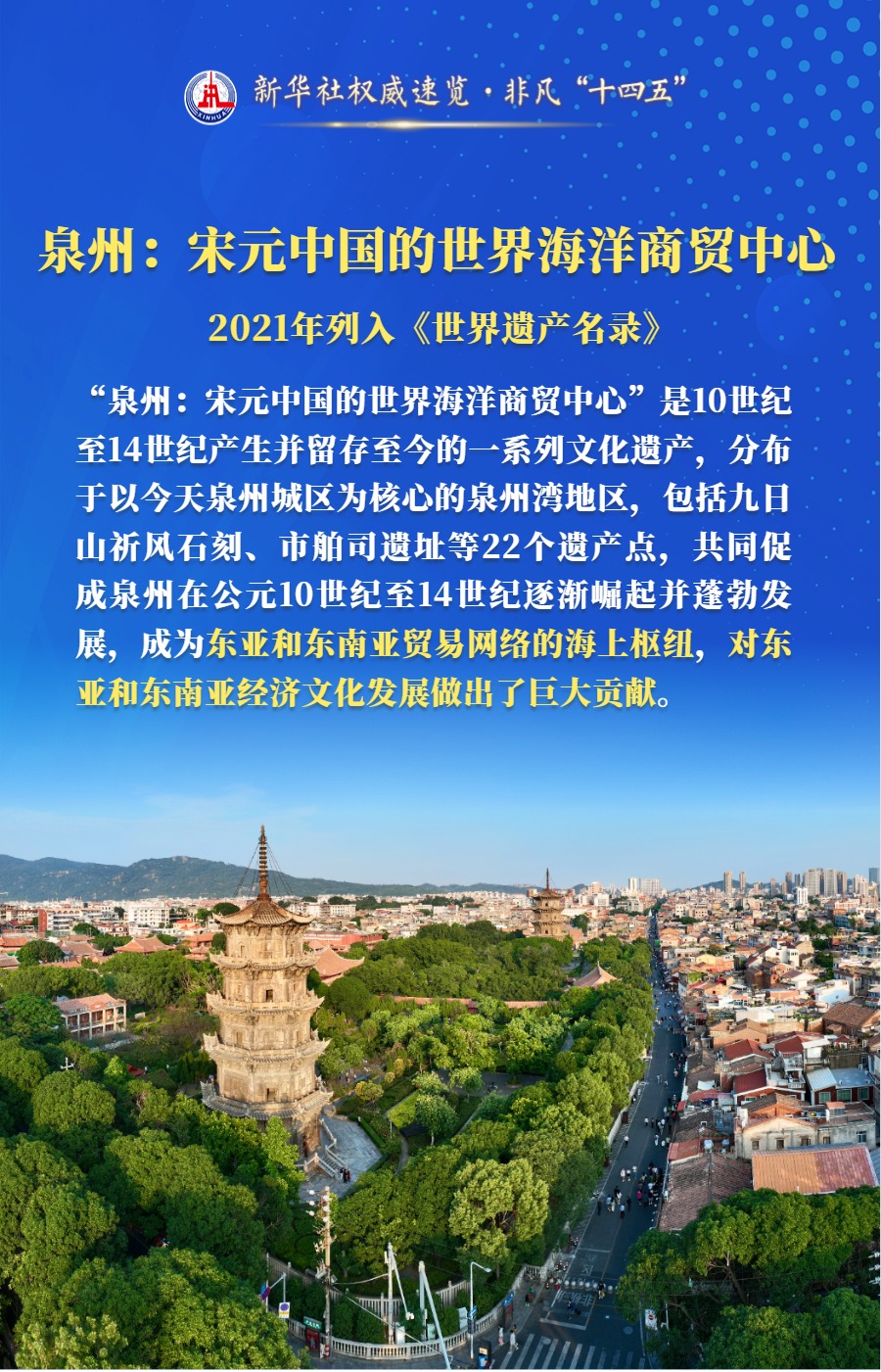 “十四五”期间,泉州、普洱景迈山古茶林文化景观、北京中轴线、西夏陵4项文化遗产成功列入《世界遗产名录》。跟随这组海报,一起了解下吧。